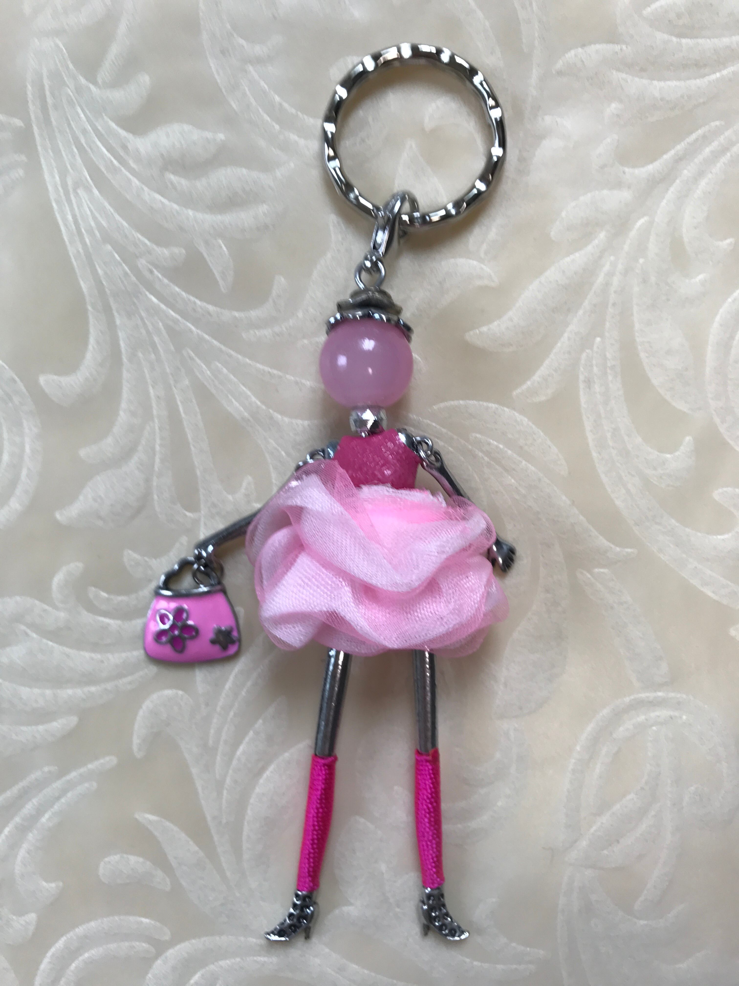 ピンクのドレスが、とっても可愛いドールキーホルダーです。手には花柄のバッグを持っています。