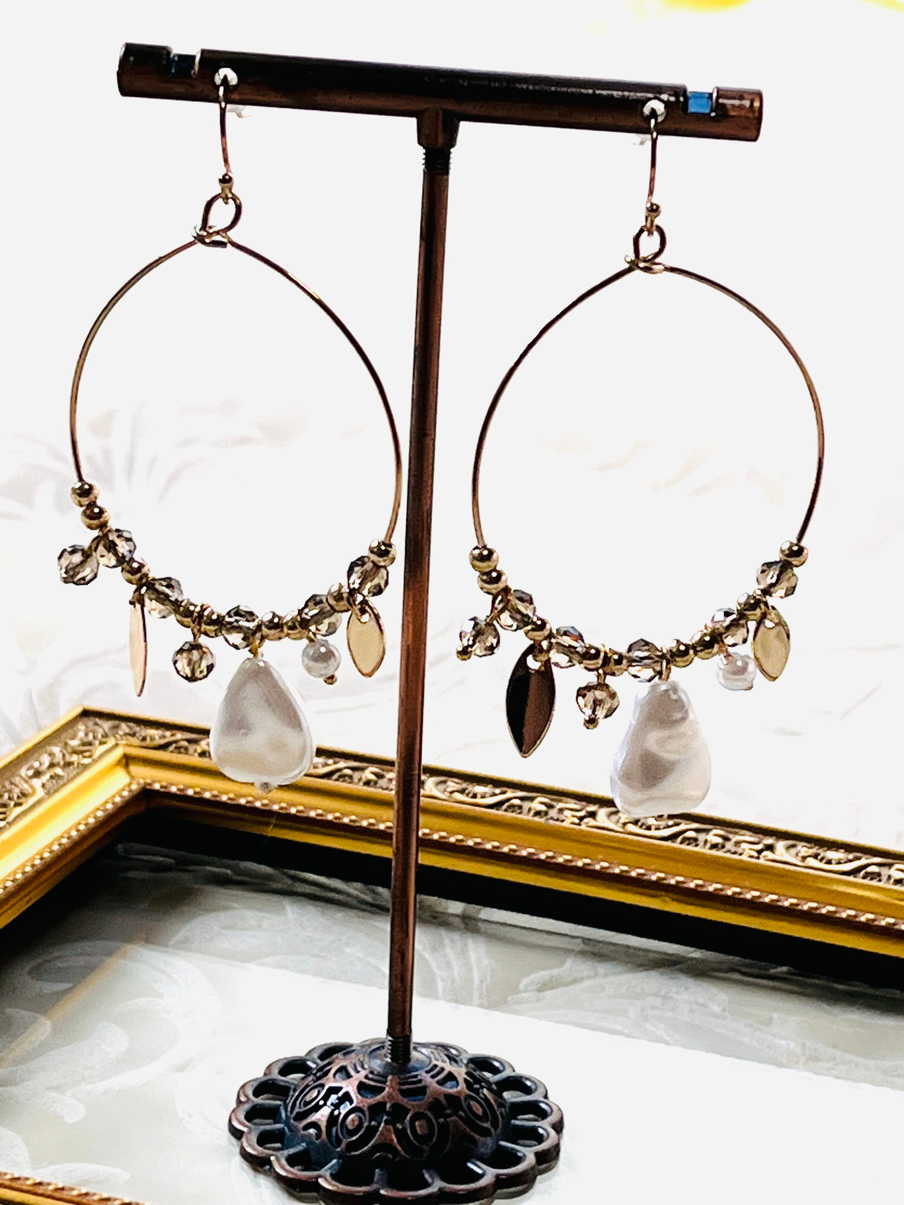 フランスらしい大振りパールループピアス。一見重そうに見えますが、軽量でつけ心地抜群!存在感があり、 ループにパールが絡まったデザインは、お世辞にもありそうでない上品さで、幅広いコーディネートにマッチします。 このパールループピアスで