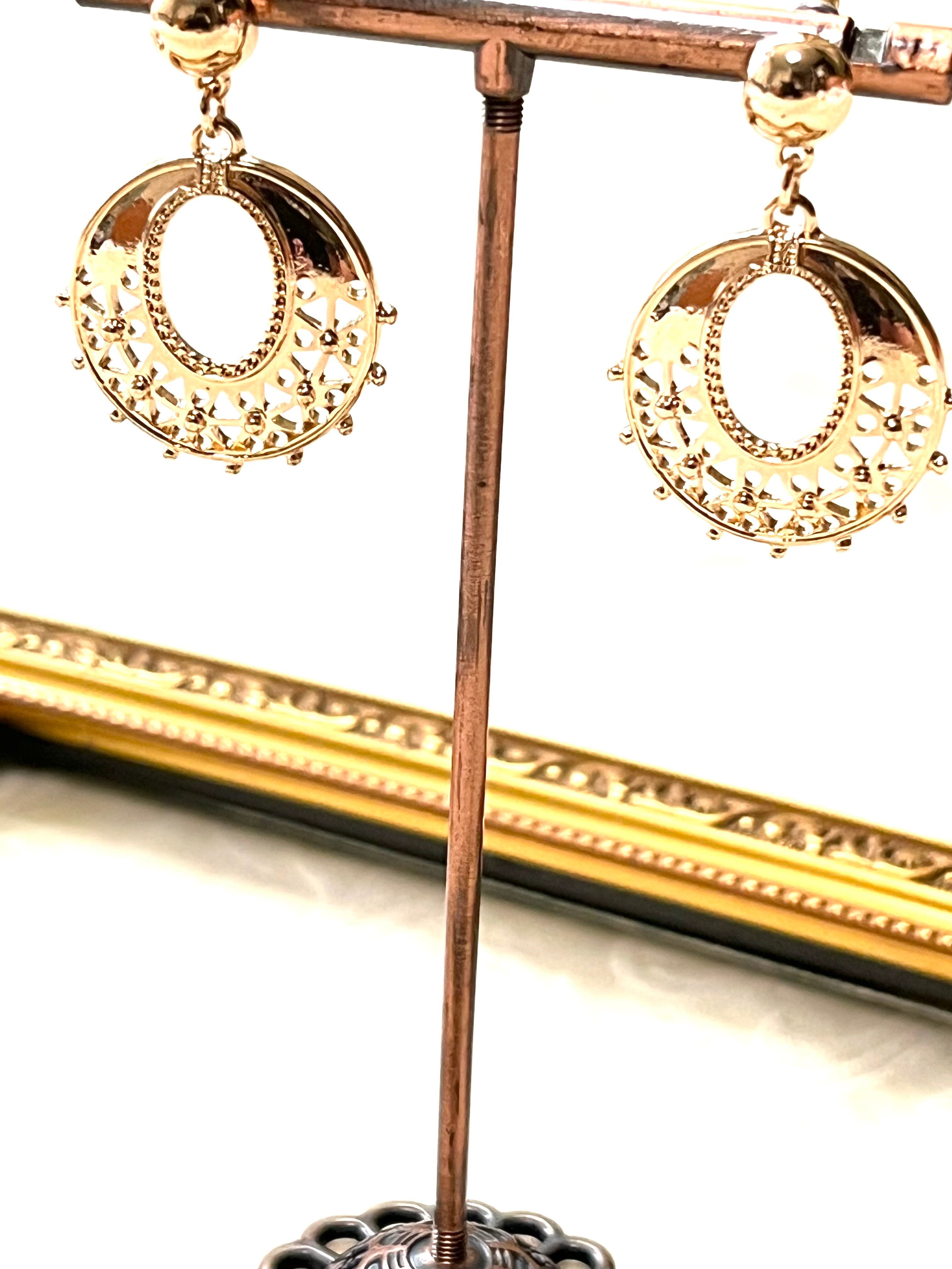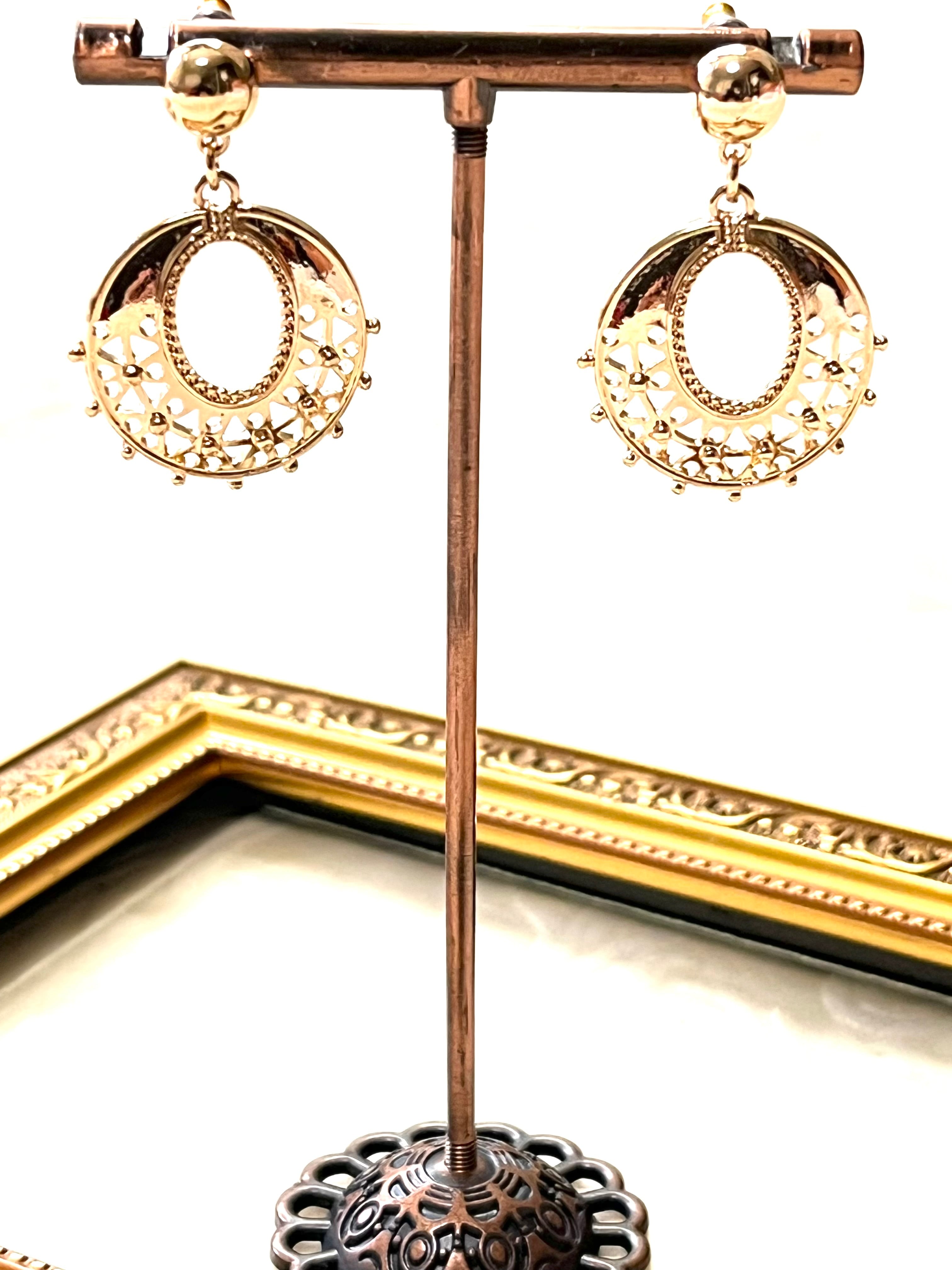 個性的な透かし模様が魅力のゴールドカラーピアスがフランスより新入荷しました。軽やかに揺れるデザインが耳元に華やかさとおしゃれ度をプラスしてくれます。日常使いから特別な日のお出かけまで、幅広いシーンで活躍する大人ピアスです。